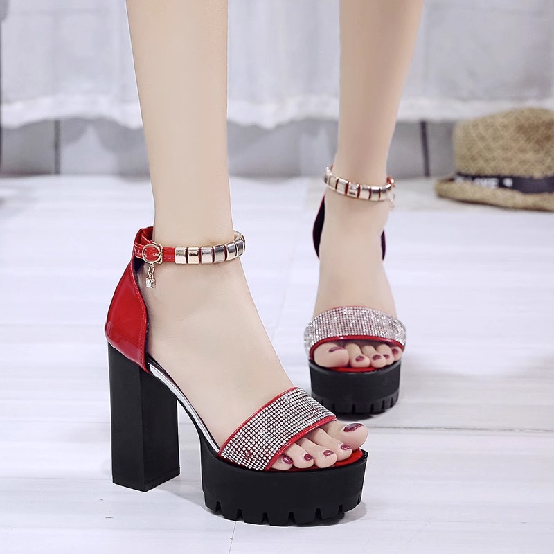 Summer New Style High-Heeled Chunky Heel Rhinestone One-Strap Women’s Shoes, Box Heel-RV1352