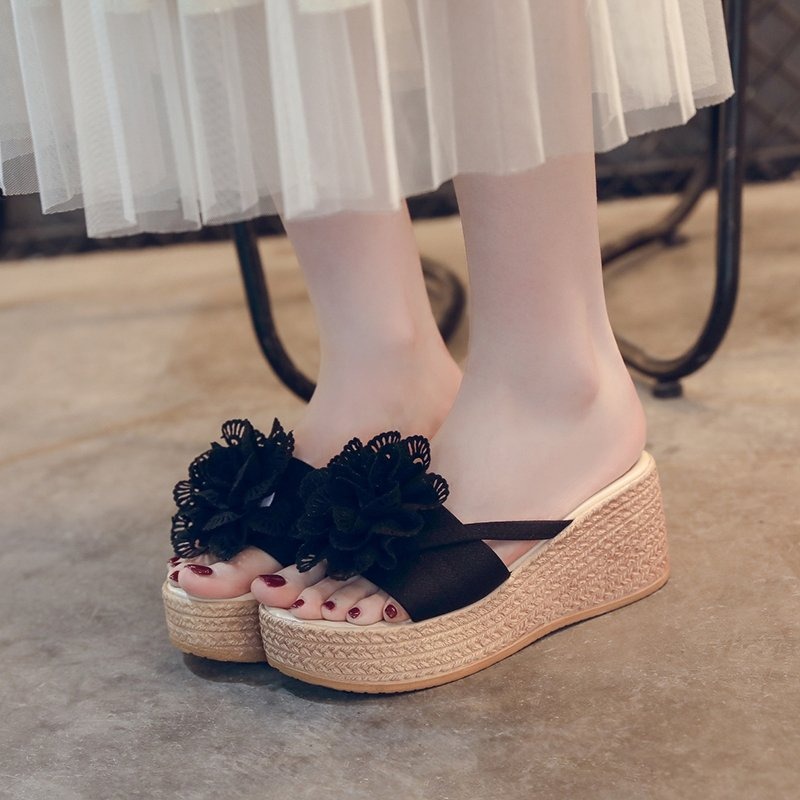 Korean Style Sweet Big Flower One-Line Outer Beach Shoes For Women, Balance Heel-RV613