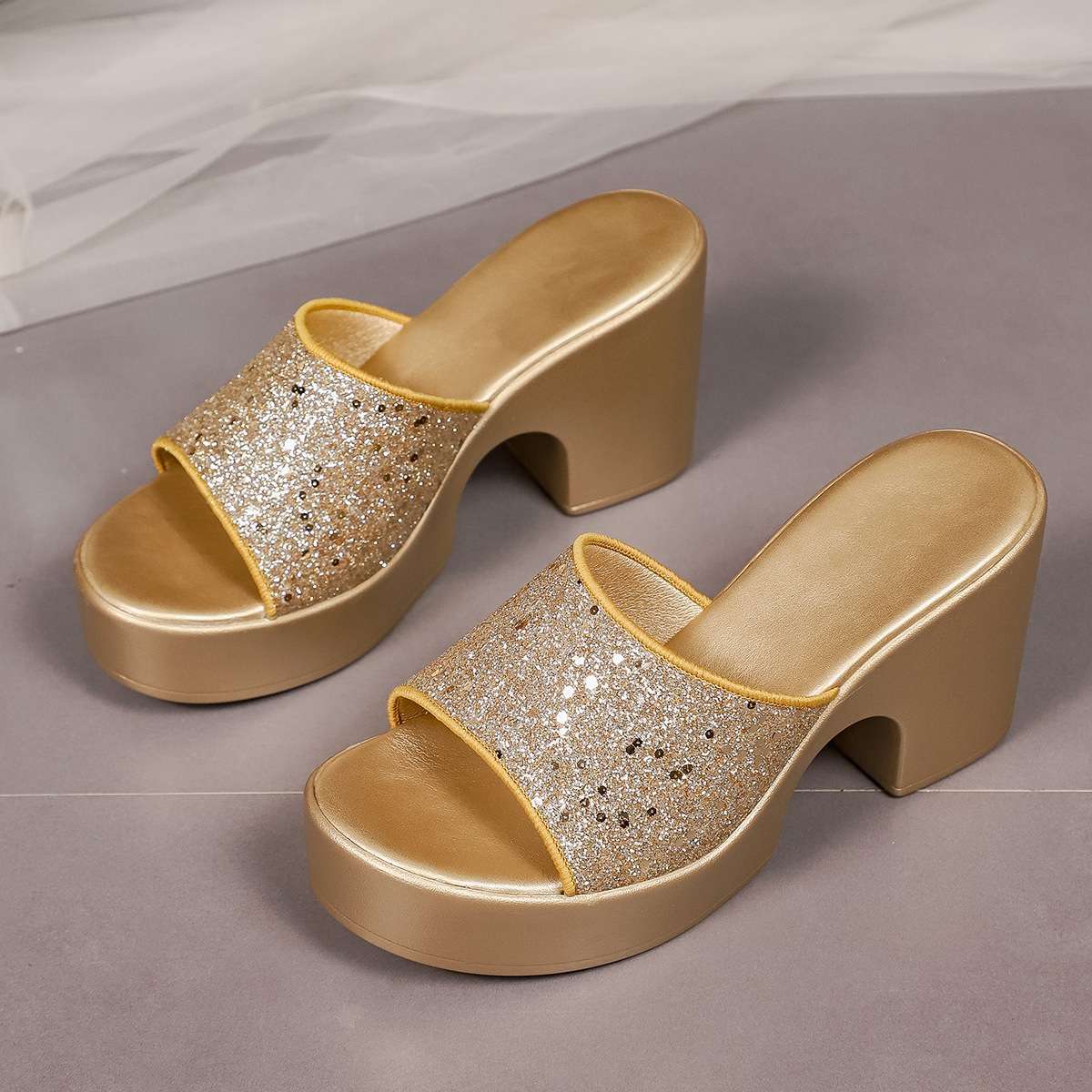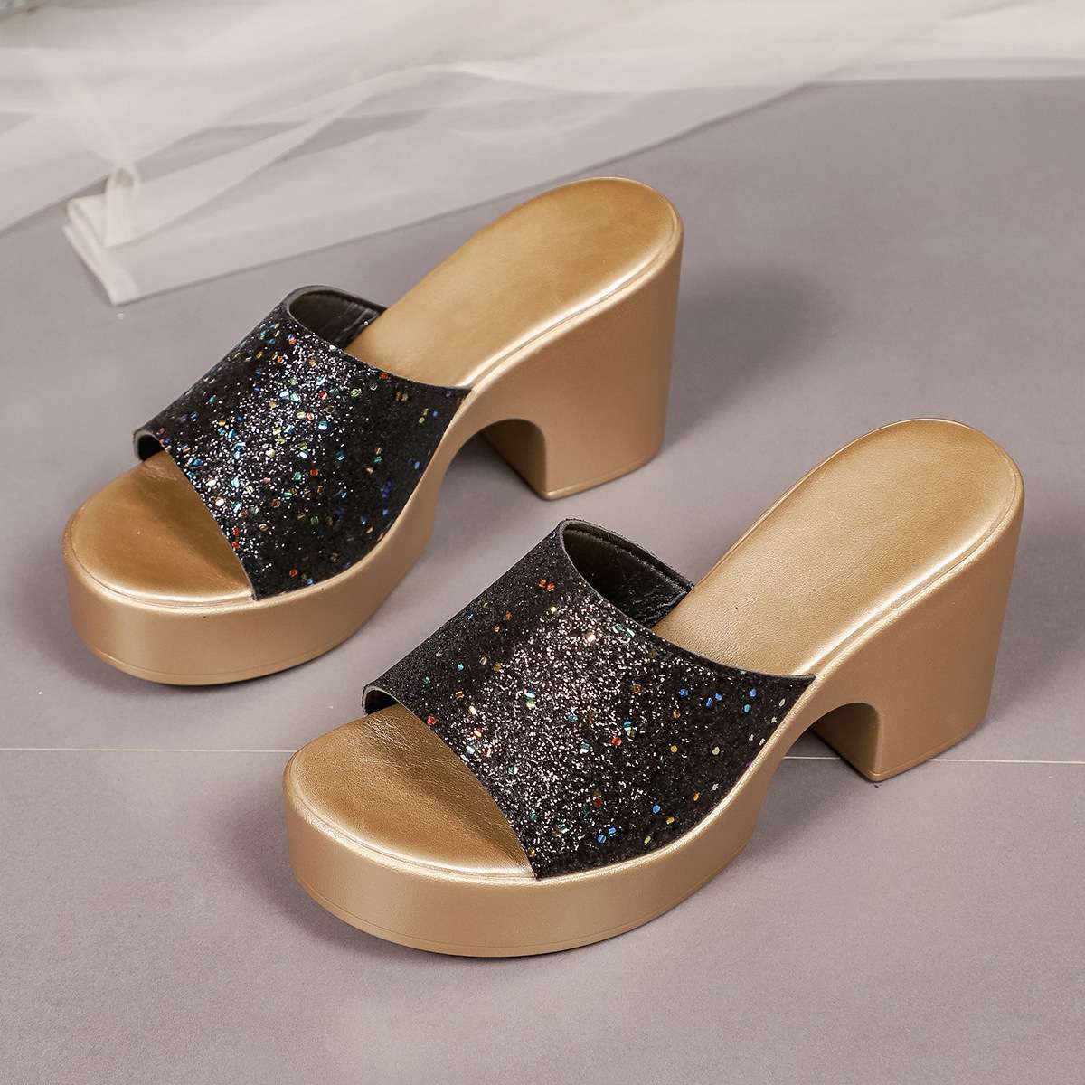 Sequined One-Strap Peep Toe Outdoor Slippers Women’s, Box Heel – RV1533
